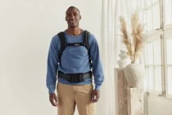 Draagzak Harmony heeft twee hoogteposities: een voor pasgeboren baby’s en een voor grotere baby’s. Als je een grotere baby draagt, verplaats je de riem naar je heupen, zodat je baby op de juiste hoogte zit en het gewicht beter verdeeld is. Zodra ze hun hoofd zelf rechtop kunnen houden, kun je ervoor kiezen om grotere baby’s, die vaak nieuwsgieriger zijn naar hun omgeving, met hun gezicht van je af of op je rug te dragen. Je hebt wat minder goed zicht op je baby als je hem op je rug draagt, dus wacht totdat hij een jaar is voordat je deze positie gebruikt.