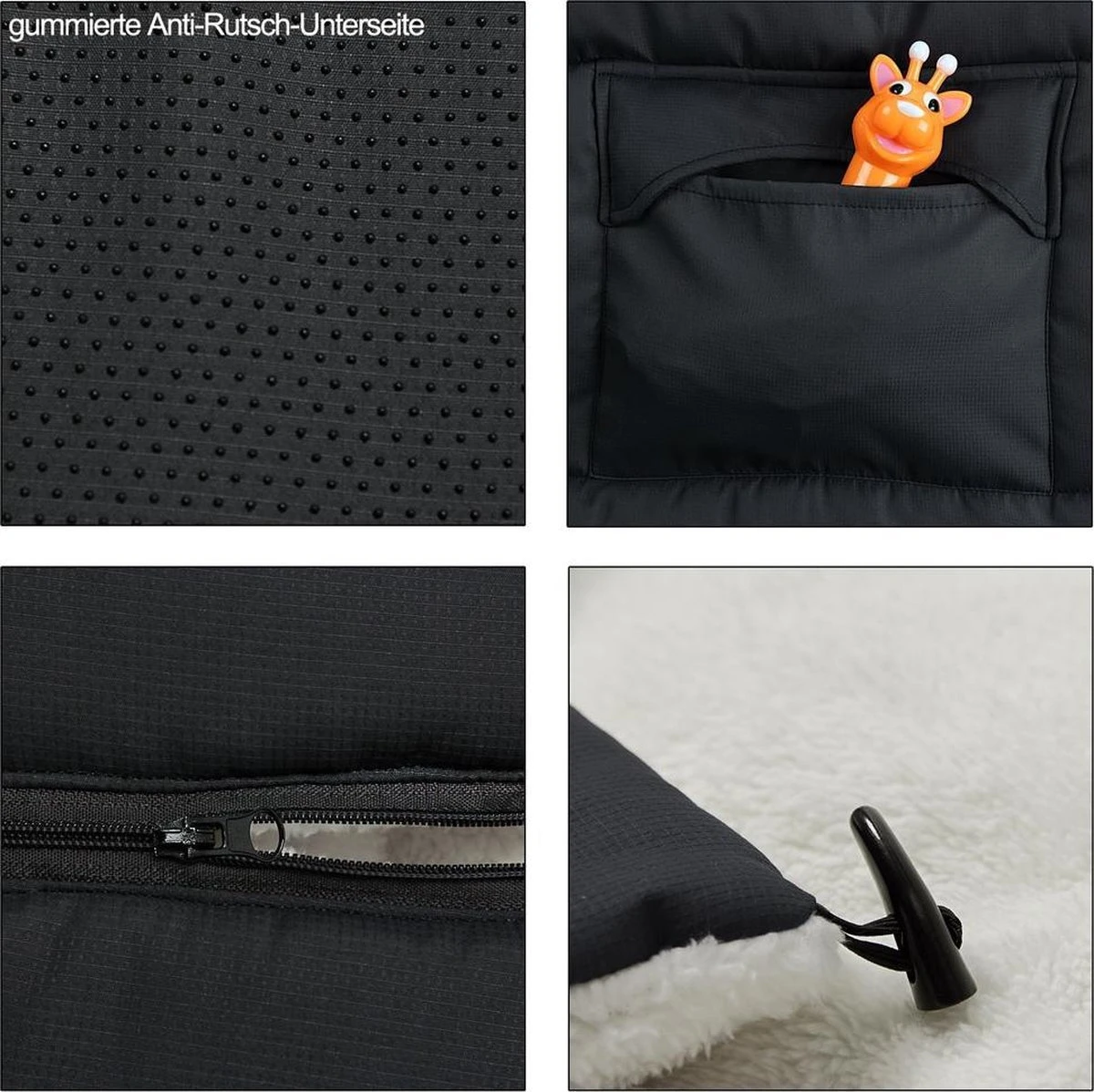 Met de openingen kun je de voetenzak snel bevestigen aan de autostoel met een 5-punts veiligheidsgordel. De rubberen onderkant voorkomt wegglijden.